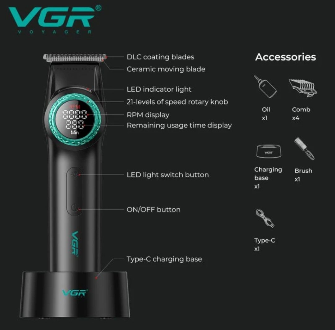 La VGR V-977 est une tondeuse électrique professionnelle conçue pour les hommes exigeants. Elle offre une coupe nette, précise et confortable grâce à sa lame en acier inoxydable auto-affûtable et son moteur puissant à faible bruit.