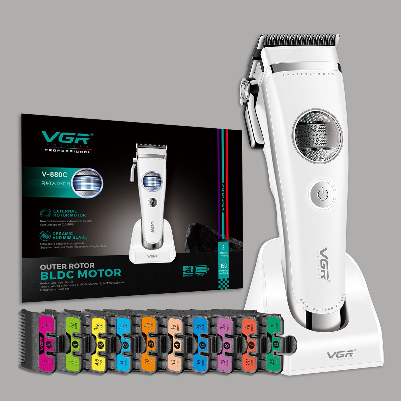 9 Peignes Guides : (1,5 mm, 3 mm, 4,5 mm, 6 mm, 10 mm, 13 mm, 16 mm, 19 mm, 22 mm, 25 mm) pour tous les besoins de coupe.